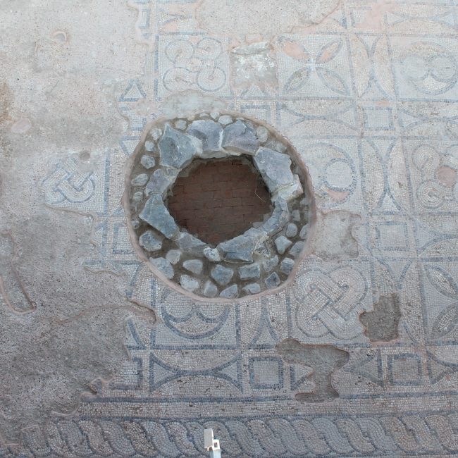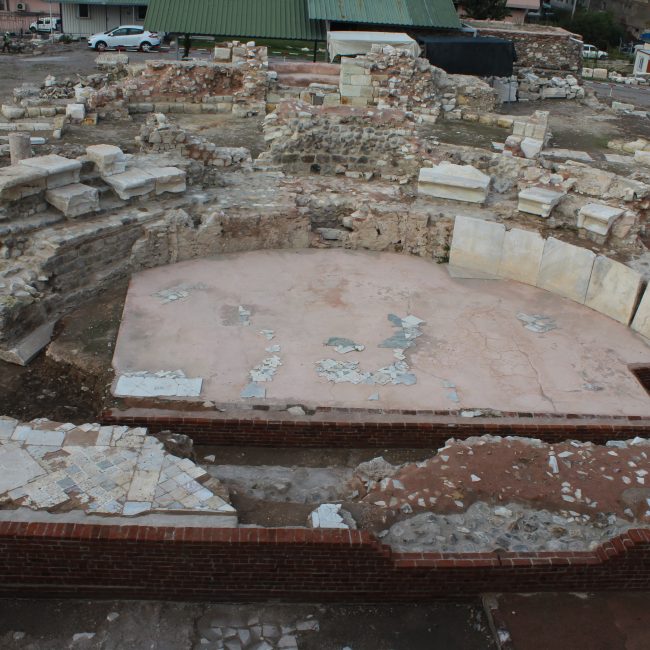 Kent Meclisi’nin güney bitişiğinde yer alan Mozaikli Yapı’nın sosyal ve kültürel faaliyetler ile siyasi toplantılara ev sahipliği yaptığı düşünülmektedir. Neredeyse tamamı ortaya çıkarılan bu yapıya, bitkisel ve geometrik ögelerden oluşan büyük ölçekli mozaik taban döşemesi nedeniyle bu isim verilmiştir. Mozaik döşemenin bir bölümü iyi korunmuş olarak günümüze ulaşmıştır.